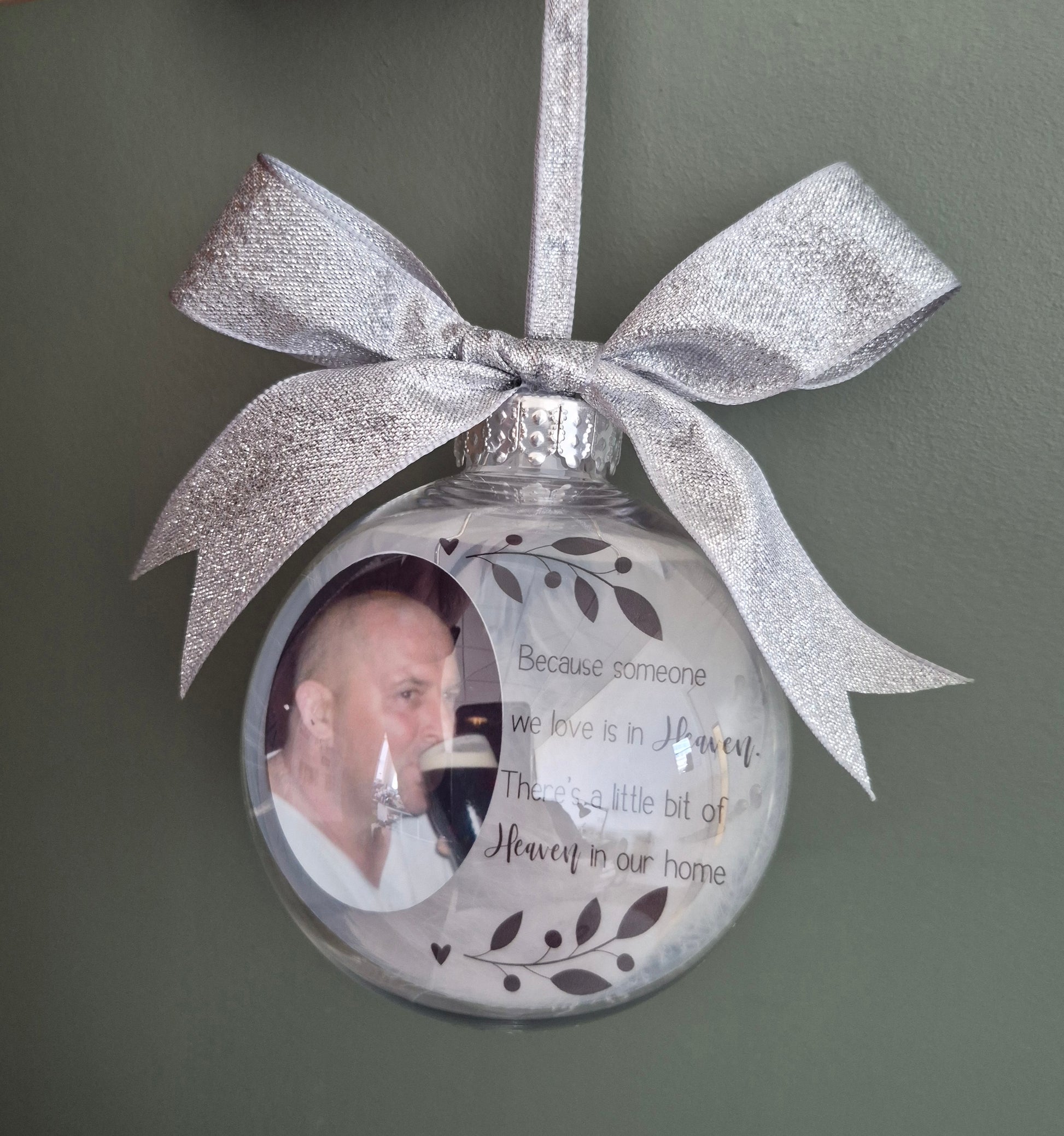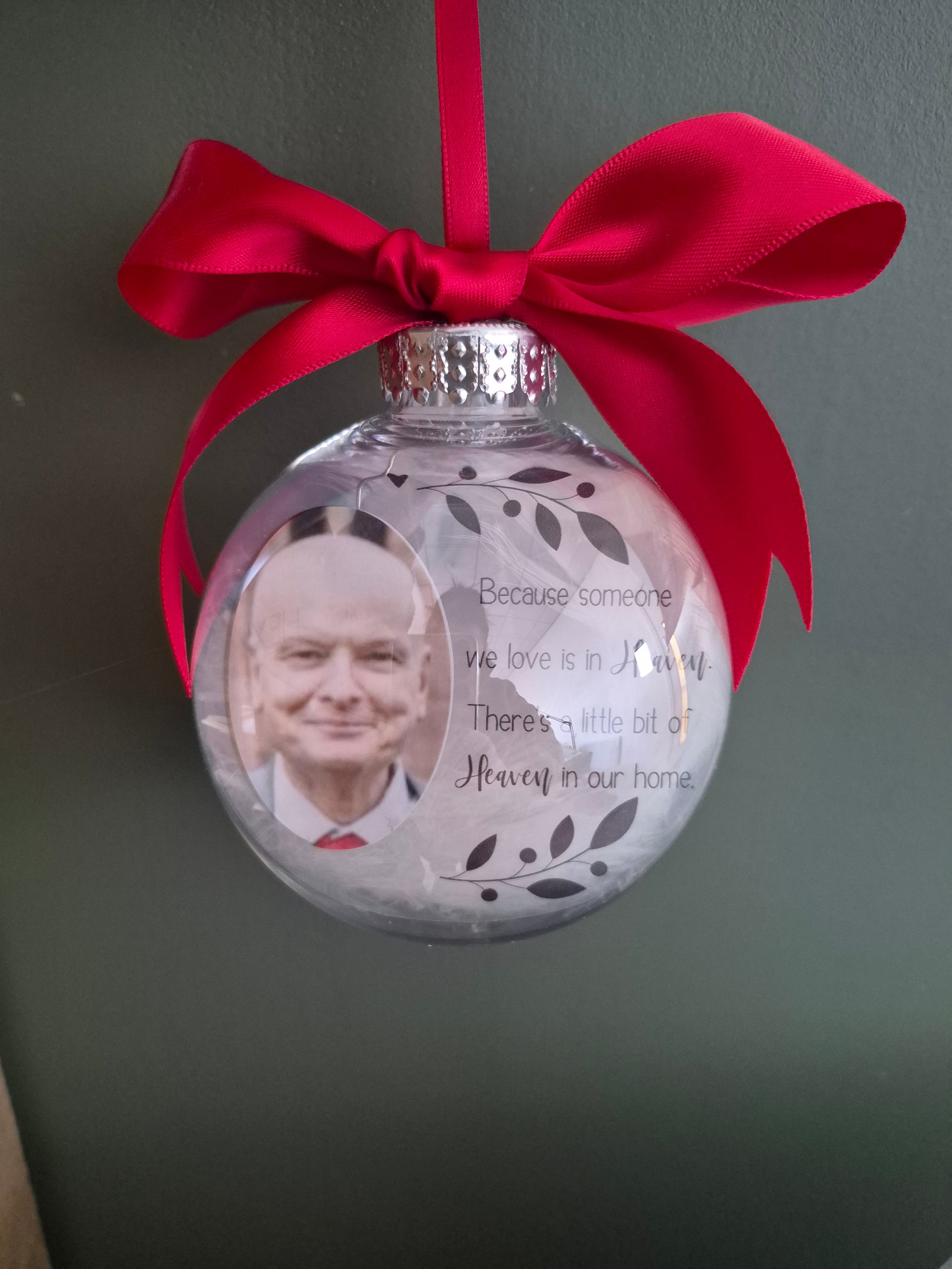 Keep the memory of your loved ones close this Christmas with our stunning 8cm shatterproof memorial bauble. Crafted for durability and elegance, this bauble features a cherished photo printed on translucent acetate, creating a unique "floating" effect that makes the image appear beautifully suspended within the ornament. White feathers are added to the inside of the bauble.