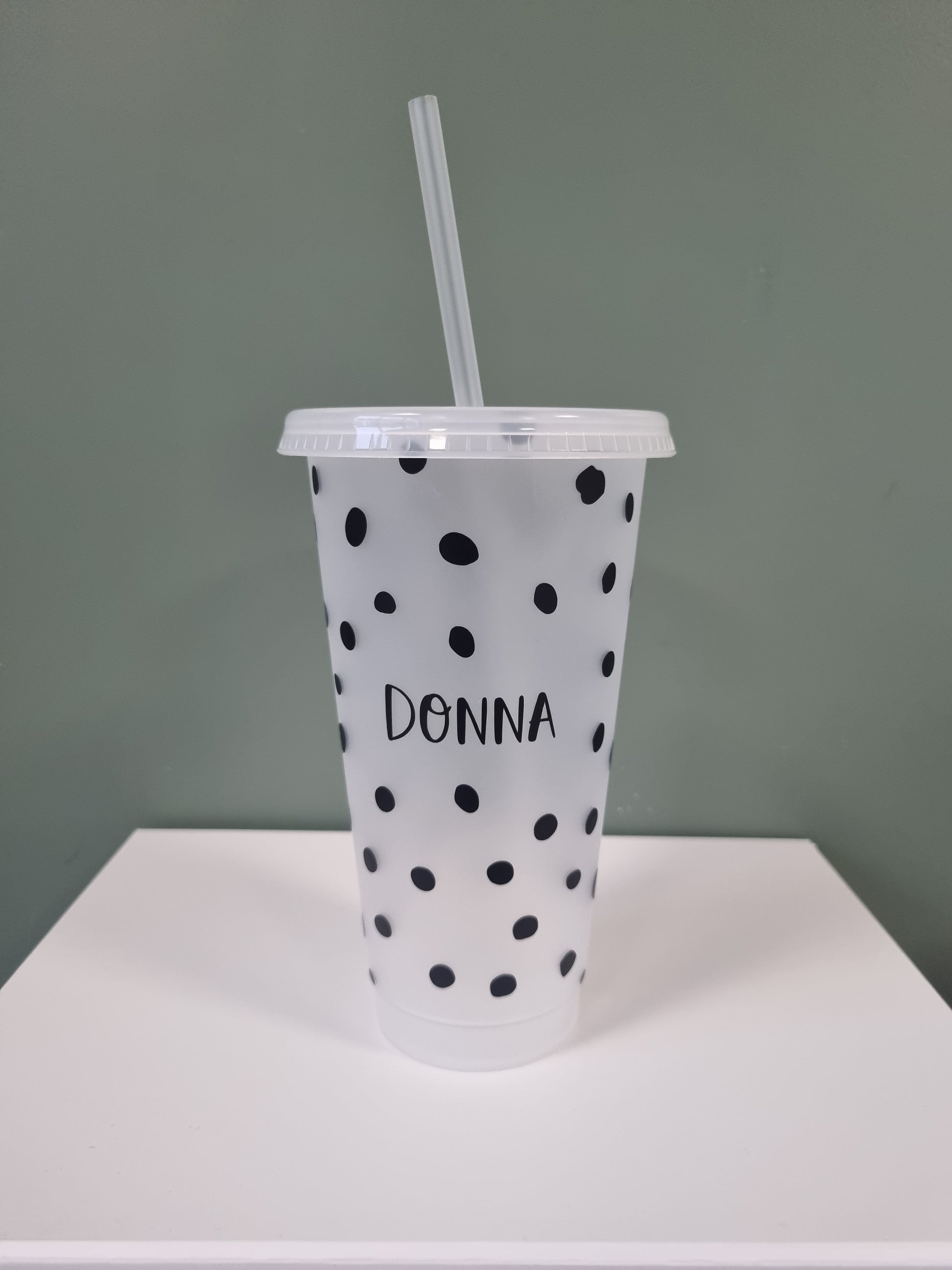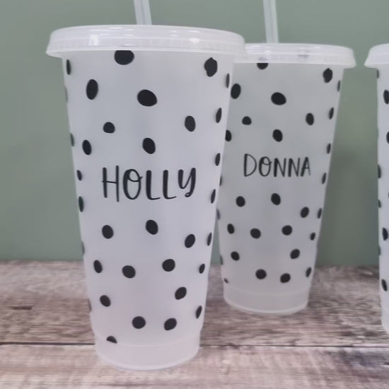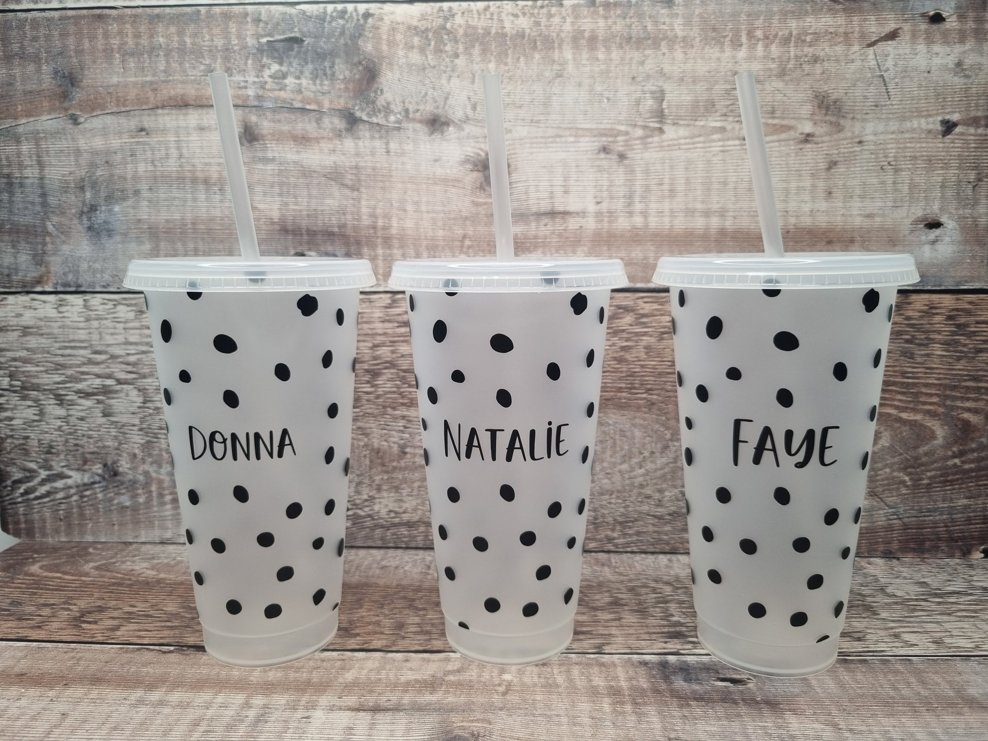These personalised 24oz cold cups are made from durable, hard frosted plastic and include a reusable lid and straw (perfect for minimising waste). Add your own flare by personalising with your name - just leave your details in the box. The spotted design comes in over 5 colours, making it perfect for Hen Parties, all inclusive holidays, girls' getaways, or simply for use at home or work. Remember to hand wash these cups and avoid submerging in water to keep the permanent vinyl intact. Each set includes the cup, lid, and straw.