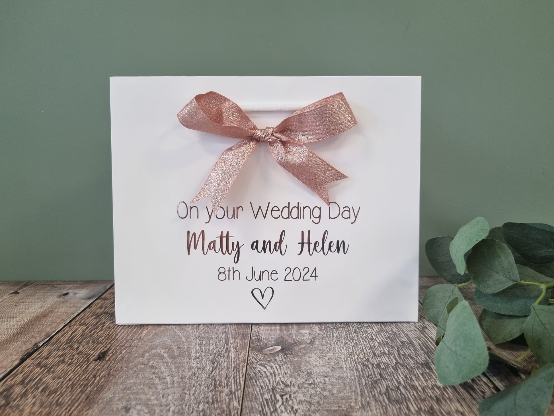 These stunning, high-quality white gift bags are the perfect finishing touch for any wedding gift. Crafted to impress, each bag is fully personalised with the newlyweds' names and wedding date, making it not just a gift bag, but a cherished keepsake for years to come. The bags can be used to store cards and mementos of the day afterwards.